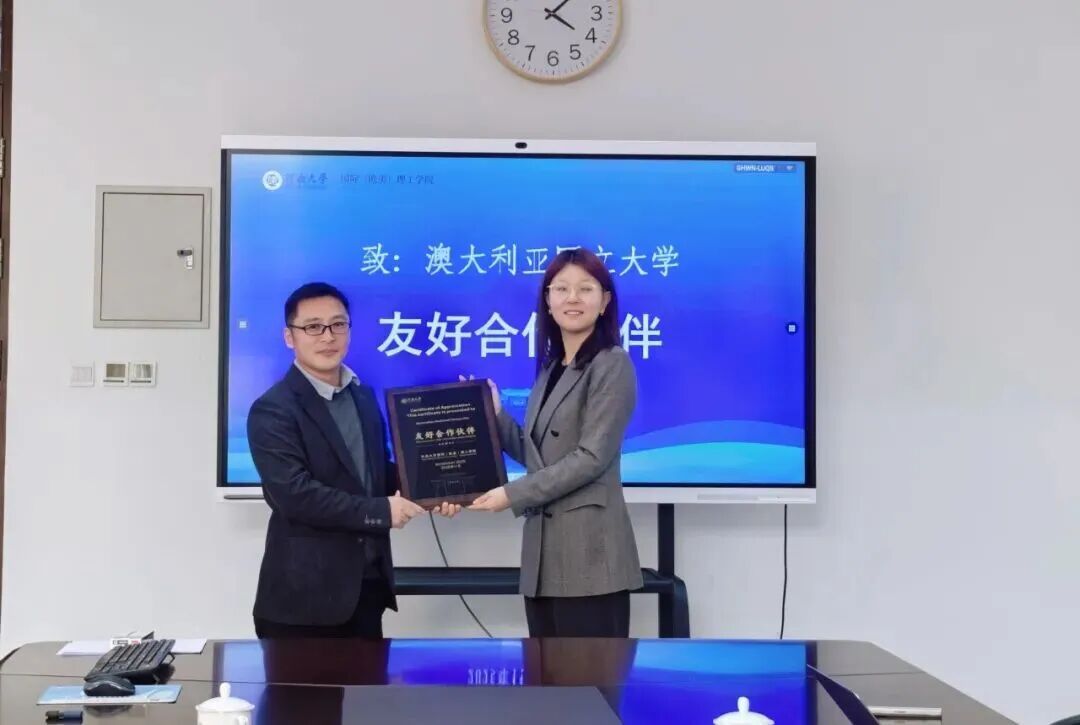 2025年11 月14日,澳大利亚国立大学(ANU)招生主管 Raven Liu到访河南大学国际理工学院,与学院党委书记赵炎、副院长崔耀平、国际合作与交流办公室主任周静围绕“本硕直通”合作方案展开深度会谈,为双方进一步深化合作筑牢基础。