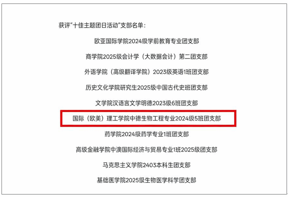 获评“十佳主题团日活动”是对2024级中德生物工程5班团支部工作的充分肯定。学院将继续支持各支部创新活动形式、深化育人内涵,引导广大青年学子在实践中锤炼品格、增长才干,将个人成长自觉融入国家发展与时代进步的洪流之中。
