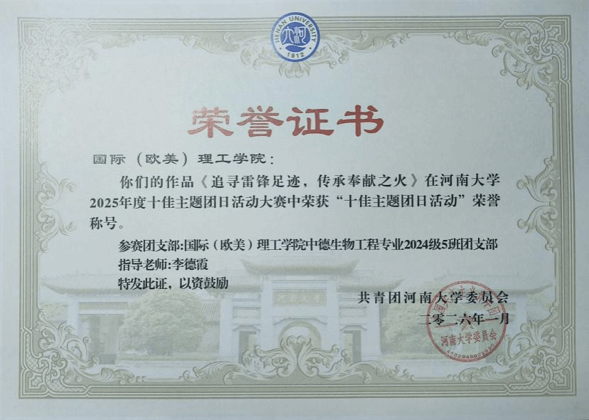 近日,河南大学2025年“十佳主题团日活动”大赛决赛结果正式公布。国际理工学院2024级中德生物工程5班团支部策划并开展的“追寻雷锋足迹,传承奉献之火”主题团日活动,以其扎实的组织、丰富的内容与显著的育人成效,在全校46个参赛项目中表现突出,最终荣获2025年度“十佳主题团日活动”荣誉称号。